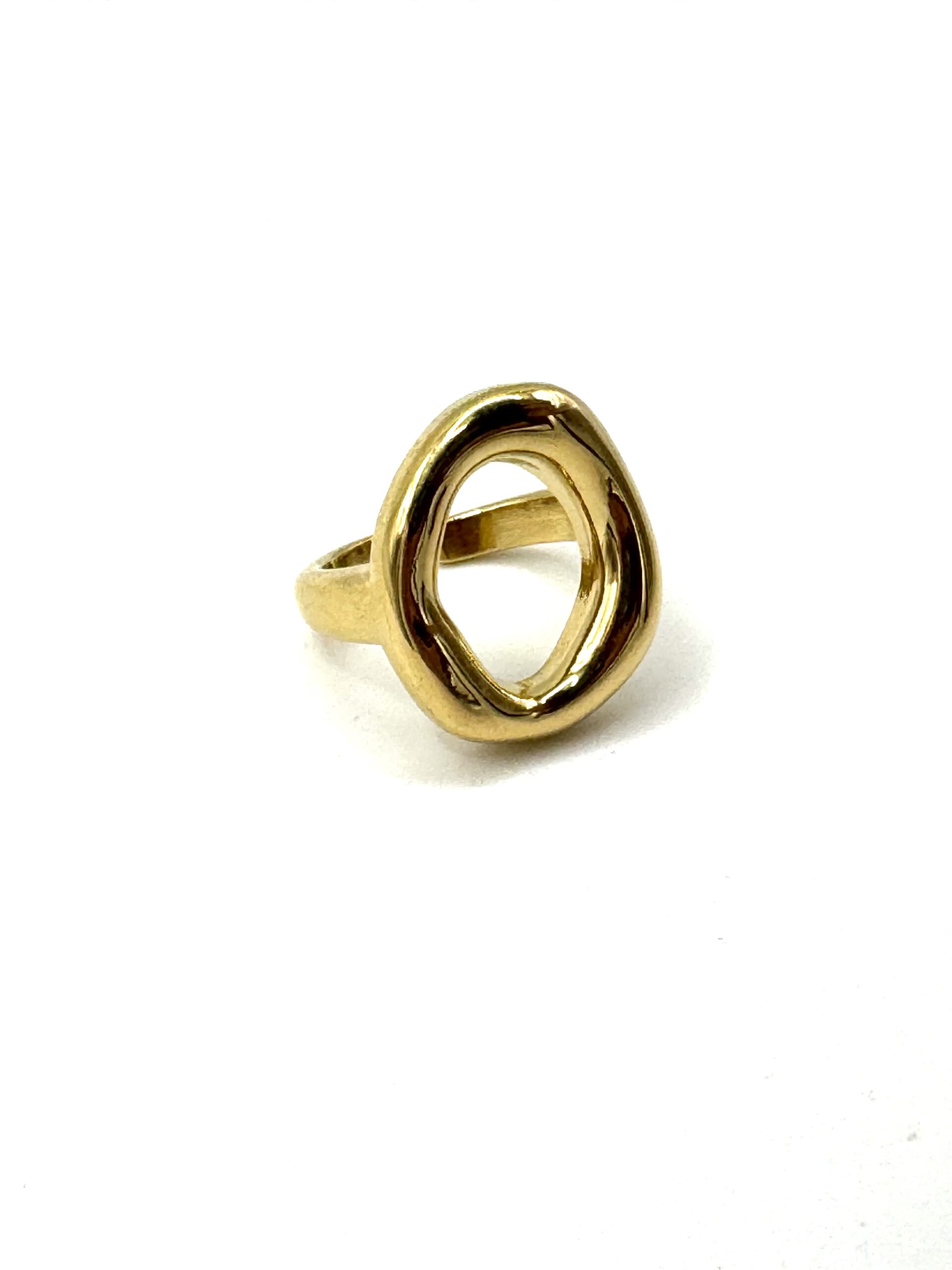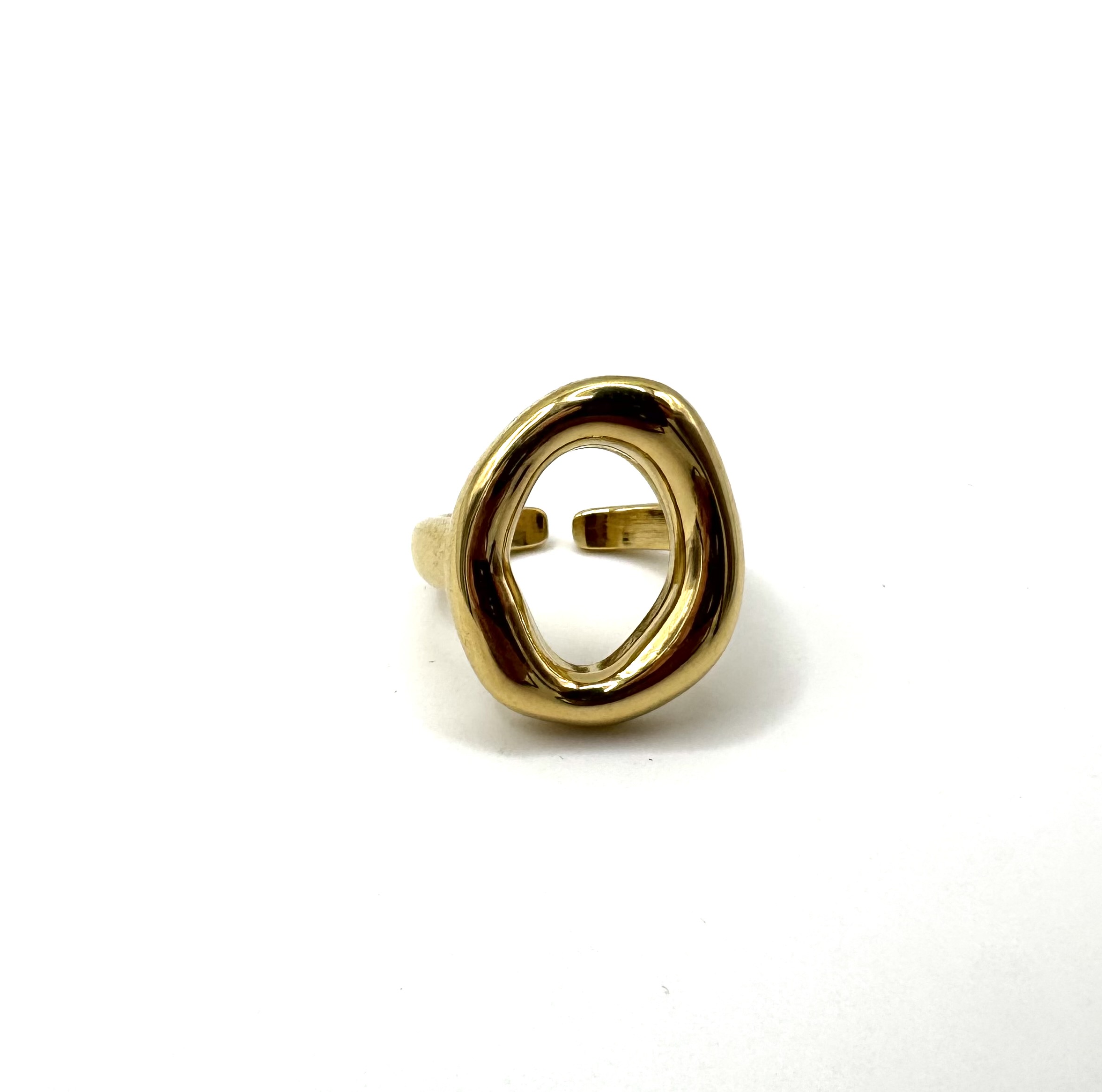 Nuestro anillo Ovalo dorado de acero inoxidable, presenta una forma irregular que le da un